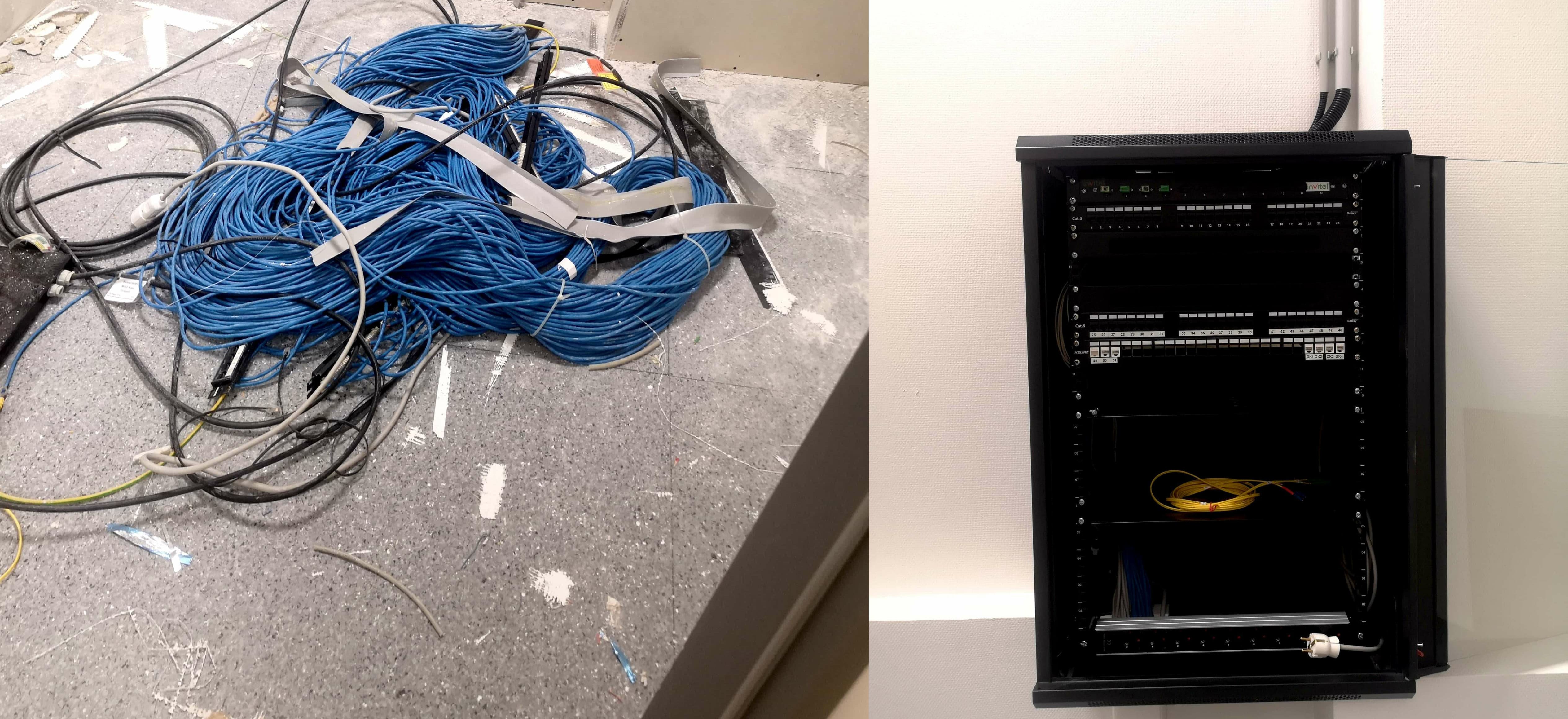 - Hálózati eszközök és kábeleik kulturált elrendezése (rackszekrény hiányában)